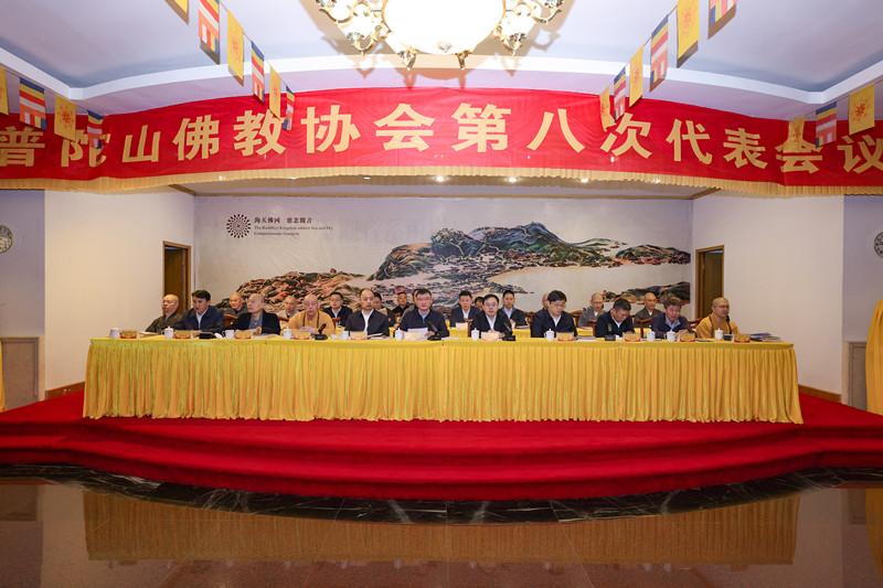 11月4日,普陀山佛教协会第八次代表会议在普济禅寺举行。浙江省民宗委党组书记吴炳芳,省民宗委副主任钟新章,舟山市委常委、统战部部长王高瞻,副市长、市公安局局长赵骏,市政协副主席、普朱管委会党委书记应朝阳,浙江省佛教协会名誉会长、普陀山佛教协会第七届理事会会长道慈法师,浙江省佛教协会会长光泉法师等出席会议。来自全山各寺院(单位)推选的132名代表和5名特邀代表参加了会议。