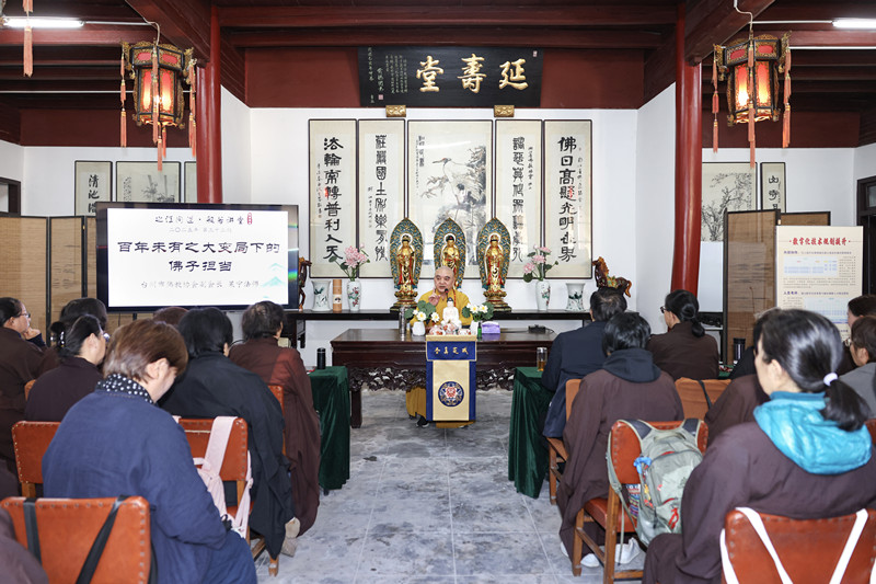 11月18日下午,2025年第三十二期“之江问道”——浙江省佛教协会般若讲堂在会本部开讲,台州市佛教协会副会长、天台山宝华禅寺住持果宁法师作了题为《百年未有之大变局下的佛子担当》的讲座。讲座由省佛协教育培训部副主任允通法师主持。